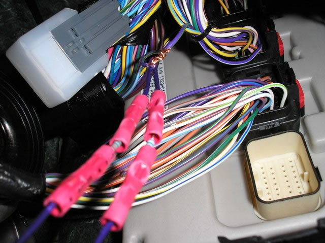 The (-) GREEN/PURPLE HORN wire, marked with the RED Clip, is located in the WHITE Plug just below the Steering Wheel and next to the YELLOW Air Bag Plug.