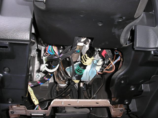 This picture shows the Under Dash Panel removed, this exposes the under dash wiring and the Ignition Switch Harness as it exits the Steering Column of the vehicle. The Ignition Switch Harness in this picture is the Large Harness with the Heavy gauge wires