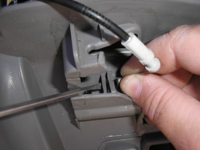 With this panel lowered, unplug the WHITE Plug in the back of the Dimmer switch and you will also need to remove the Hood Release Cable before you can complete the removal of this panel.