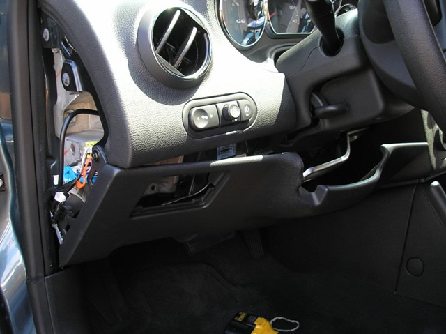 This picture shows the UNDER DASH Panel on this vehicle, all though there will be no wires found under this panel it must be removed, this will be the location of the Remote Starter when installed.