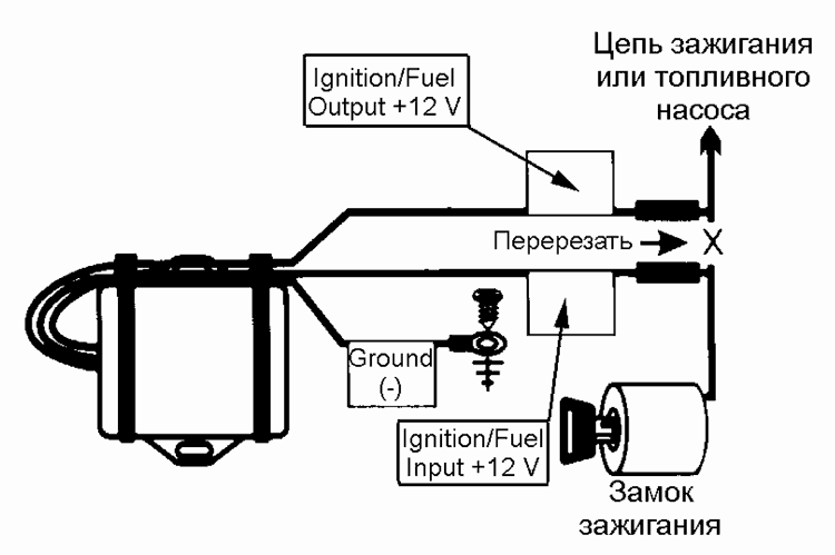 Беспроводный иммобилайзер должен блокировать электрическую цепь автомобиля, на которую подается питание + 12 В, когда включено зажигание. При перерезании данного провода двигатель автомобиля должен глохнуть.