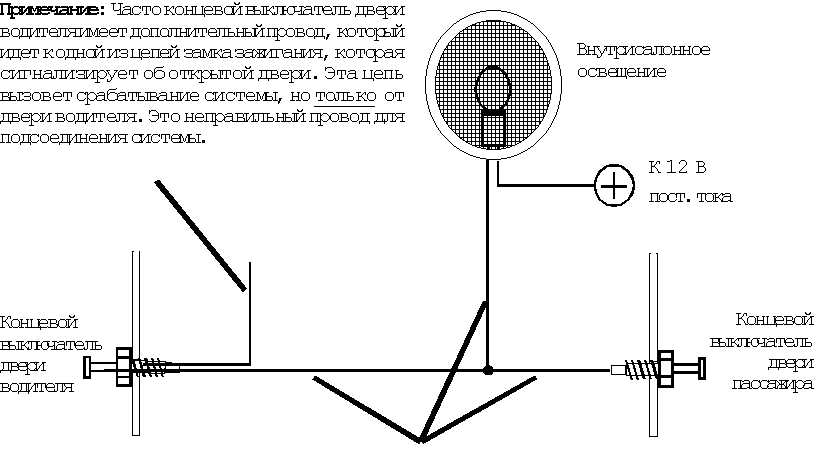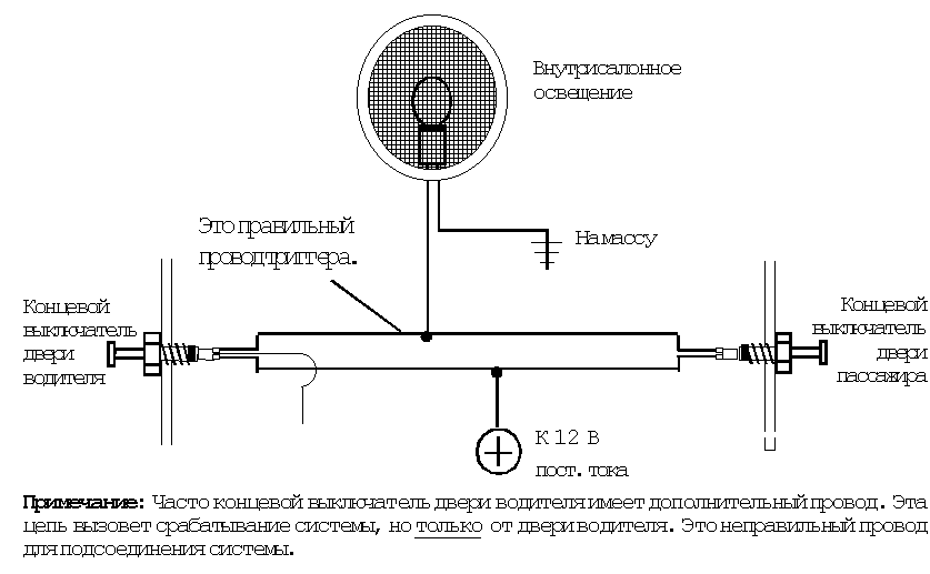 Примечание 2: На тех автомобилях, где на панели приборов стоят индикаторы закрывания дверей, все двери изолированы друг от друга диодами. Не соединяйте вместе все концевые выключатели. В этом случае необходимо подсоединить ЗЕЛЕНЫЙ провод к проводу, по которому осуществляется непосредственное питание внутрисалонного освещения автомобиля.