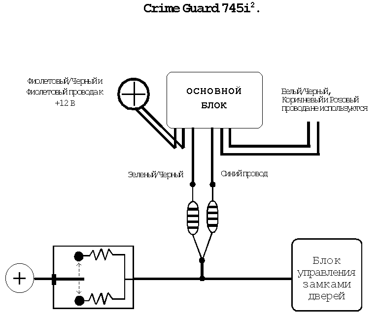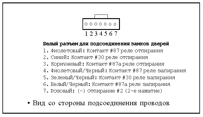 Функции ФИОЛЕТОВОГО провода идентичны функциям ЗЕЛЕНОГО провода за одним исключением: ФИОЛЕТОВЫЙ провод используется на автомобилях с концевыми выключателями дверей, имеющими положительную полярность (+12 В) (например, марки Форд).
