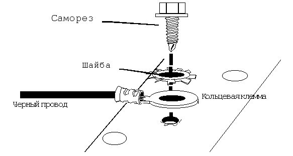 Подсоединение: При помощи припаянной или хорошо обжатой кольцевой клеммы подсоедините ЧЕРНЫЙ провод к кузову автомобиля, используя имеющиеся болты на кузове автомобиля. Место крепления Черного провода должно быть тщательно очищено от краски, масел и грязи до чистого металла. Никогда не подсоединяйте ЧЕРНЫЙ провод системы к другим имеющимся проводам массы и к листовым металлическим поверхностям, кроме крайней необходимости.
