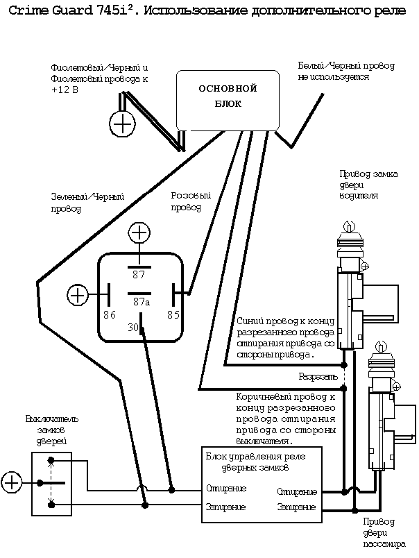 Примечание : Реле замков или блок управления со встроенными реле управляется при помощи выключателей. Когда выключатель находится в состоянии покоя, на этих двух проводах присутствует напряжение +12 В или меньше. Правильная точка подсоединения находится между выключателями и реле.