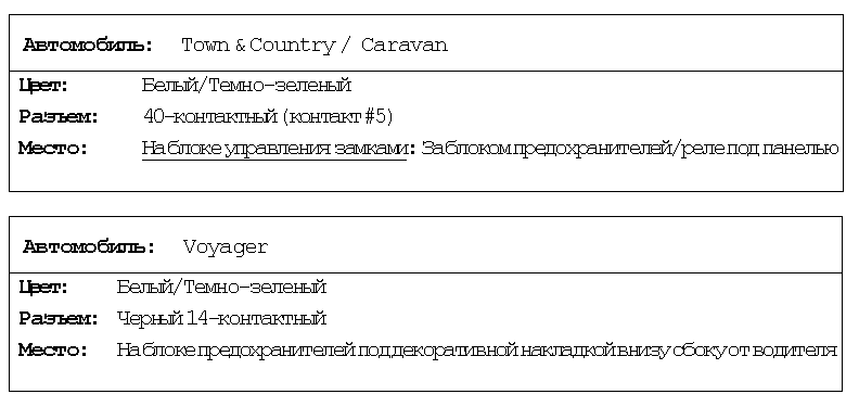 На автомобилях марки Chrysler Town & Country, Dodge Caravan выпуска 1996г. и Plymouth Voyager установлена импульсная однопроводная система дверных замков с отрицательной полярностью. При переключении выключателя двери в положение lock (запирание) или unlock (отпирание) отрицательный импульсный сигнал поступает на резистор.