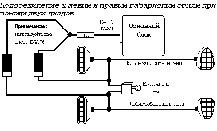 Большинство автомобилей европейского производства имеют раздельные цепи правых и левых габаритных огней. Если правые и левые габаритные огни находятся в разных цепях, то для подсоединения БЕЛОГО провода к обеим цепям необходимо использовать два диода (от 6 до 10 А) или два реле. На указанной ниже схеме показано подсоединение при помощи диодов.
