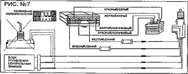 Схема подключения блока для автомобилей, имеющих управляющий выключатель электромеханических замков дверей и водительской двери автомобиля, но без электромотора ( Saab, Opel и др. ) (Рис.7).