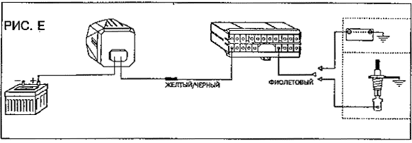 Схема подключения блока к системе управления электромеханическими замками дверей, которые управляются с помощью клавиши, установленной внутри салона автомобиля. Провода управления электромеханическими замками такой системы при нейтральном положении клавиши имеют отрицательный потенциал (Chrysler, Ford и др.) (рис. 3).