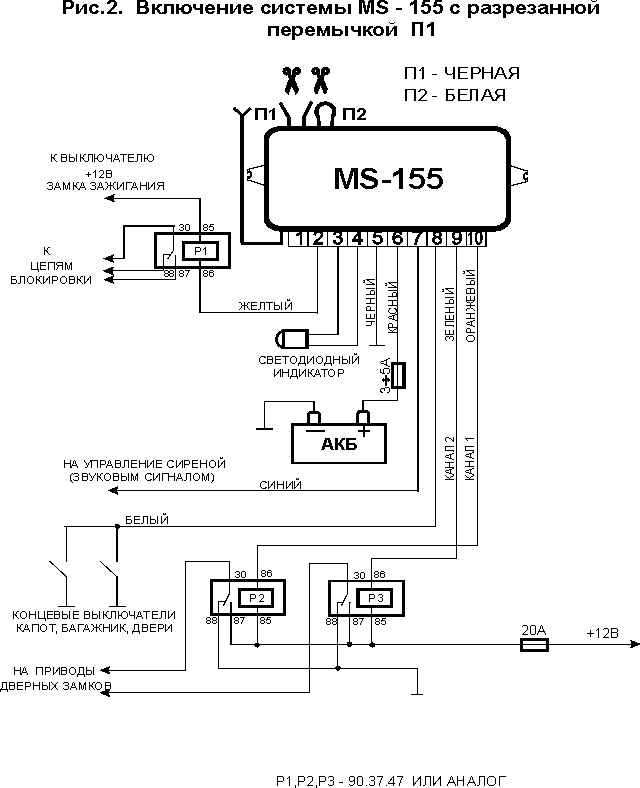 Программирование режима автоматического "перевключения" осуществляется с помощью перемычки белого цвета, если перемычка не перерезана (вариант фирмы-изготовителя), режим "автоперевключения" выключен, если перемычка перерезана - режим "автоперевключения" включен. "Автовозврат" сигнализации в режим "охраны" сопровождается однократным звуковым и световым сигналом. Сразу после снятия с охраны индикаторный светодиод сигнализации начинает равномерно мигать в течение 30 секунд, отведенных владельцу для того, чтобы подойти к автомашине, открыть дверь, капот/багажник, после чего светодиодная индикация прекращается. Если же срабатывание контактной зоны не произошло, сигнализация возвращается в режим "охраны", а светодиодный индикатор вспыхивает непрерывно, после чего переходит в экономичный режим индикации.