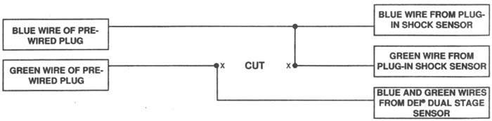 GREEN (-) Multiplex input: Inputs shorter than. 8 seconds will trigger the Warn Away® response, while inputs longer than. 8 seconds will trigger full alarm sequence and report zone four. If installing an optional DEI dual stage sensor, connect to the GREEN wire as shown below. The diagram below eliminates the need for diodes to isolate the sensors, as well as providing a separate zone for each sensor.