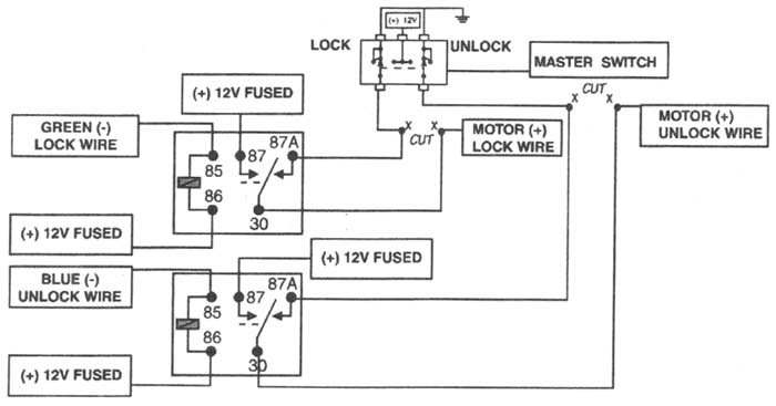 This system usually requires a negative pulse to unlock, and cutting the wire to lock the door. In some vehicles, these are reversed. It is found in late-model Nissan Sentras, some Nissan 240SX, and Nissan 300ZX 1992-up. It is also found in some Mazda MPV's and some Mitsubishi's.