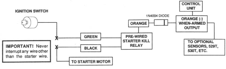 H1/1 ORANGE (-) ground-when-armed output: This wire supplies a (-) 500 mA ground as long as the system is armed. This output ceases as soon as the system is disarmed. The orange wire is pre-wired to control the 8618 starter kill relay.
