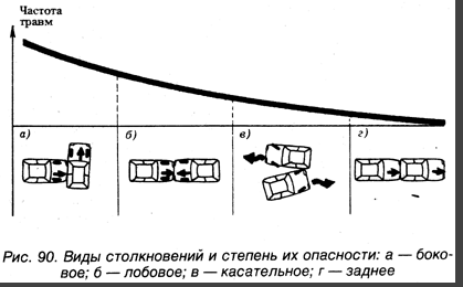Самое главное в аварийных ситуациях — не допускать лобового столкновения, отличающегося наибольшей тяжестью последствий. В результате столкновения транспортных средств в городах получают ранения и погибают соответственно 29,2 и 20,3% всех пострадавших, в опрокидываниях — 6,4 и 5,6%, а при наезде на препятствие — 5,3 и 4,8%. Отсюда вывод: любые косые или касательные удары либо съезд с дороги, даже опрокидывание менее опасны, чем лобовое столкновение.