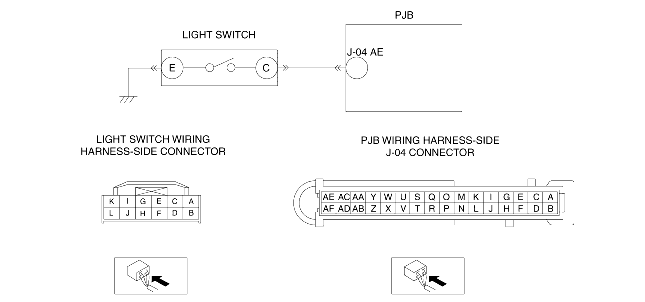 • Inspect the light switch connector terminals for poor connection (such as damaged/pulled-out pins, and corrosion).