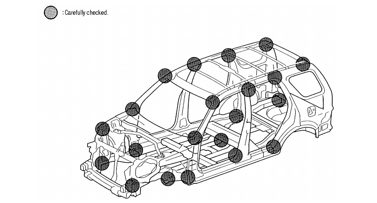 Distortion to the vehicle, bends, inclines and gaps between parts should be thoroughly checked. Also, check for paint peeling at welded areas, corners and the sealing coat.