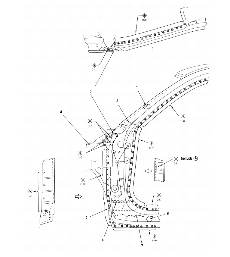 - Remove the repair part, and weld the front pillar lower stiffener, upper stiffener, and side sill reinforcement.