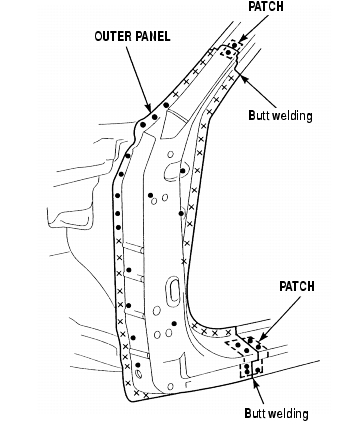 - Attach a patch at the cut section of the front pillar and side sill outer panel, and plug weld them.