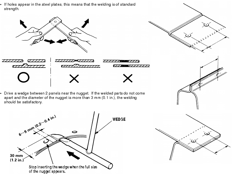 When it is not possible to remove any rust or paint attached to the welding surfaces. When the tip of the spot welder cannot be inserted into the welding section. When the welding surfaces can be seen from the outside and welding will impair the exterior appearance. In all these cases, the gas welding method should be employed. Moreover, if it is not possible to perform spot welding because of space restrictions, plug welding using on the arc welding method may be performed instead. For plug welding, the sections to be welded must be close together.