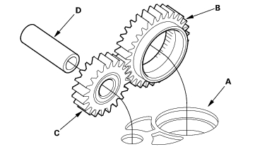 - Install the main separator plate (A) and two dowel pins on the torque converter housing. Then install the ATF pump drive gear (B), driven gear (C), and ATF pump driven gear shaft (D). Install the ATF pump driven gear with its grooved and chamfered side facing down.