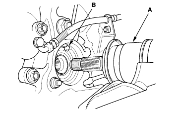 Be careful not to damage the ABS wheel sensor (B). Pull on the outer joint. Do not pull on the driveshaft because the joint may come apart.