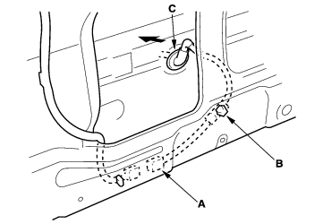 - Slide the door lower trim (A) forward and remove it. Clips (B, C) will stay in the body.