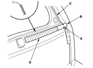 - Insert the roof side rear trim in the roof side front trim (D), and fit the clips (A, B) into the holes in the body, then push on the trim until the clips snap into place.