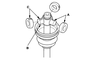 Reinstall the inboard joint onto the driveshaft by aligning the marks (A) on the inboard joint and the rollers. Hold the driveshaft so the inboard joint points up to prevent it from falling off.