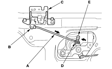 - Using a clip remover, detach the clips (E), and remove the cable from the clip (F). Remove the grommet (G) from the body, then remove the hood opener cable from the vehicle. Take care not to bend the cable.