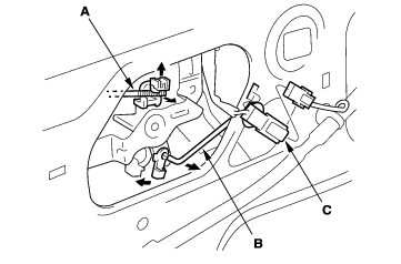- Disconnect the hatch glass rod (A), hatch glass open rod (B), and actuator connector (C), then detach the connector from the tailgate.