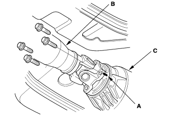 - Make a reference mark (A) across the propeller shaft (B) and rear differential companion flange (C).