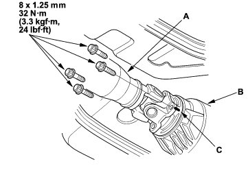 - Install the propeller shaft (A) onto the transfer (B) by aligning the reference mark (C).