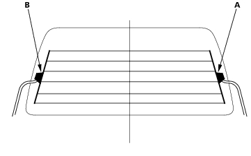 - Check for voltage between the positive terminal (A) on the right side of the glass and body ground with the ignition switch and defogger switch ON.