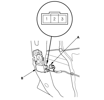 - Disconnect the 3P connector (A) from the tailgate knob switch (B).