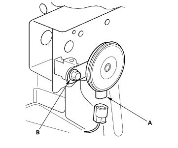 - Test the horn by connecting battery power to the terminal (A) and grounding the body ground (B). The horn should sound.