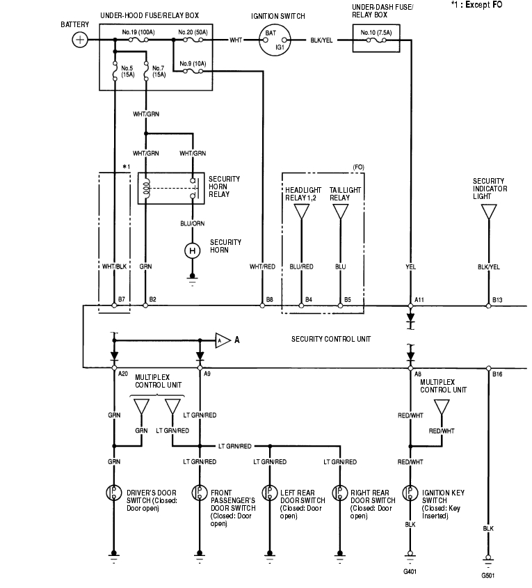 For the system to arm, the ignition switch must be off and the key removed. Then, the security control unit must receive signals that the doors, hood, and trunk lid or tailgate are closed and locked. When everything is closed and locked, none of the control unit inputs are grounded.