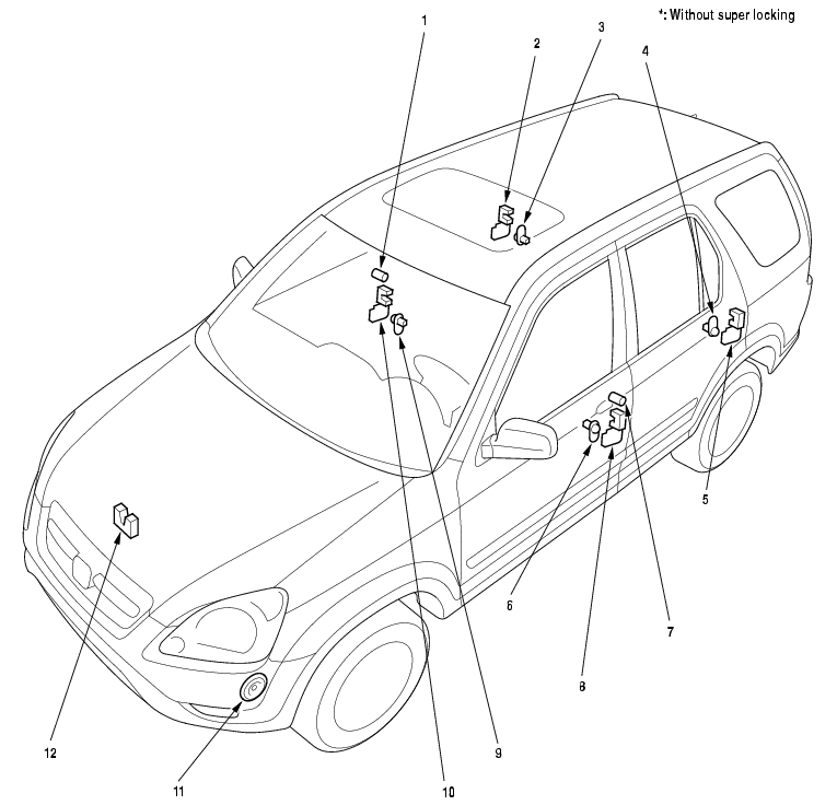 The door switches, hood switch, trunk latch switch or tailgate latch switch, door lock knob switches, and door lock key cylinder switches are all open,. 10 seconds after the doors are locked with the key or the lock knob, or immediately after locking the doors with the remote transmitter, the system arms.