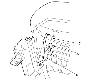 - Detach the harness clip (C), and pull the seat belt switch/tensioner harness (D) out through the hole on the seat track.