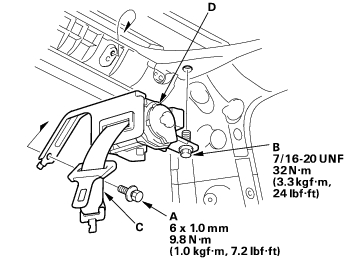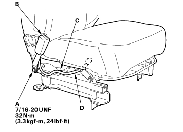 - Remove the retractor mounting bolt (A) and retractor bolt (B), then remove the center seat belt (C) and retractor (D).