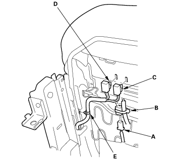 - If equipped with a seat-belt switch and/or seat belt buckle tensioner, disconnect the seat subharness connector (A) (driver's with seat heater), and remove the harness band (B) (driver's with seat heater and seat belt buckle tensioner), and detach the seat belt switch connector clip (C), seat belt buckle tensioner connector clip (D), and harness clip (E). LHD is shown, RHD is symmetrical.