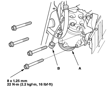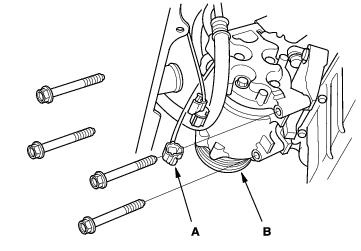 - Disconnect the compressor clutch connector (A), then remove the A/C compressor (B) without disconnecting the A/C hoses.