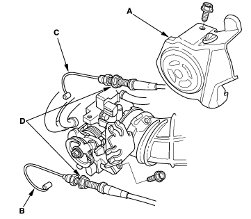 - Remove the throttle cover (A). Fully open the throttle link and cruise control link by hand, then remove the throttle cable (B) and cruise control cable (C) from the links. Loosen the locknuts (D), and remove the cables from the bracket.