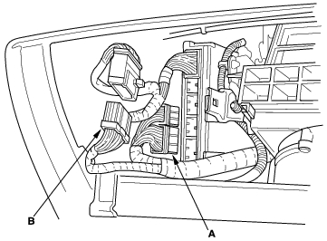- Connect the ECM/PCM connectors (A) and main wire harness connector (B).
