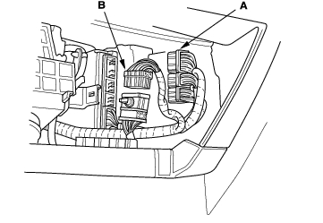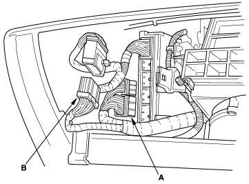 - Remove the harness clamps (A) and grommet (B), then pull the engine wire harness through the bulkhead.
