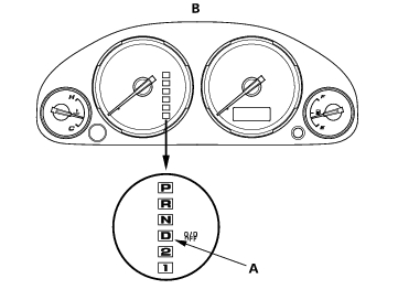 When the Powertrain Control Module (PCM) senses an abnormality in the input or output systems, the [D] indicator (A) in the gauge assembly (B) will usually blink.