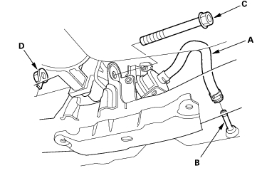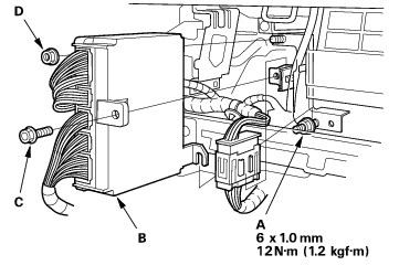 - Loosen the mounting nut (A) on the lower portion of the PCM (B), and remove the mounting bolt (C) and nut (D).