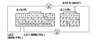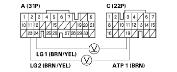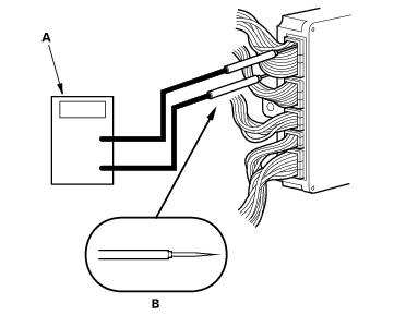 - Inspect the circuit on the PCM, according to the DTC troubleshooting with a digital multitester (A) and tapered tip probe (B) as shown.