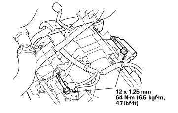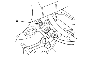 - Install the front mount bolt (A) and nut (B), connect the ATF cooler hose (C) to the ATF cooler line, then secure the hose with the clip (see page 14-151) .