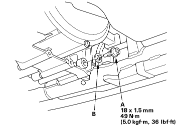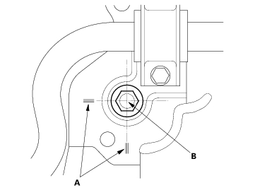 - Align the reference marks (A) with the center of the sub-frame mounting bolts (B), then tighten the bolts to the specified torque.