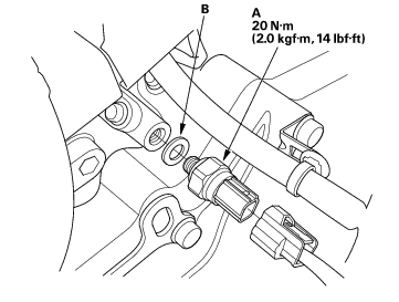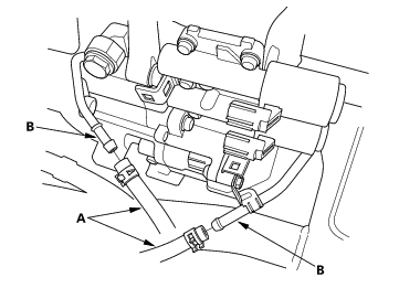 - Connect the ATF cooler hoses (A) to the ATF cooler lines (B) (see page 14-151) .